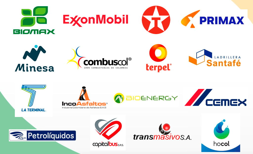 Algunos de nuestros clientes: Biomax, Exon Mobil, Texaco, Primax, Minesa, Combuscol, Terpel, Ladrillera Santafé, El Terminal, Inco Asfaltos, BioEnergy, Cemex, Petrolíquidos, Capital Bus, Transmasivos, Cortes Cañon.